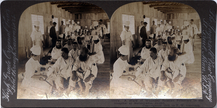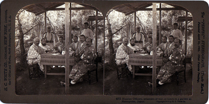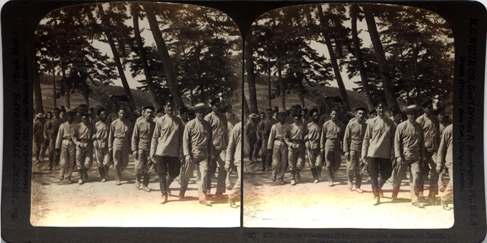(68) 8374 Russian Prisoners out for excise near Matsuyama, Japan. COPYRIGHT 1905 BY H. C. WHITE CO. H. C. WHITE CO., Gen'l Office N. Bennigton. Vt., U. S. A. Branch Offices; New York, Chicago, London. The "PERFEC" STEREOGRAPH. (Trade Mark.) Patented April 14, 1903. Other Patents Pending 8376 Russian Prisoners at their midday meat in Myosaji temple, Matsuyama, Japan. COPYRIGHT 1905 BY H. C. WHITE CO. H. C. WHITE CO., Gen'l Office N. Bennigton. Vt., U. S. A. Branch Offices; New York, Chicago, London. The "PERFEC" STEREOGRAPH. (Trade Mark.) Patented April 14, 1903. Other Patents Pending 1146V. A Ward of Wounded Russian Prisoners